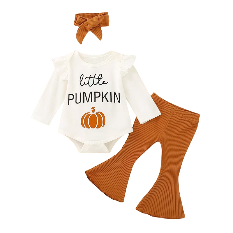 Get your little one ready for Halloween with this adorable Baby Girl Halloween Pumpkin Romper 3-Piece Set. This festive outfit includes a cute ruffled long sleeve romper with a playful pumpkin print, matching ribbed flare pants, and a charming bow headband. Made with soft and breathable materials, this set is perfect for keeping your baby cozy and stylish during the fall season. Whether for a Halloween party, family photos, or everyday wear, this outfit is sure to bring out the festive spirit!