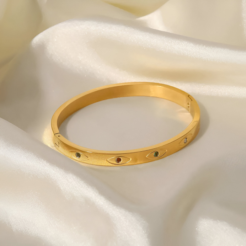 Discover the captivating beauty of the Colorful Round Zircon Eye Bracelet, designed to elevate your accessory game. This stunning bracelet features a unique eye motif adorned with vibrant round zircons, making it a perfect statement piece for any occasion. Crafted from high-quality stainless steel and plated with luxurious 18K PVD gold, this bracelet promises durability and a radiant shine that will last for years to come.