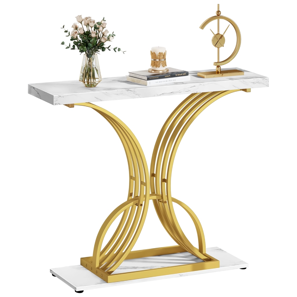 Add a touch of stunning contemporary charm to your living room, entrance, hallway, or entryway with this elegant 40in Gold Narrow Console Table. Featuring a luxurious faux marble top and a striking gold-finished metal frame, this console table is the perfect blend of style and functionality. Whether you’re looking to display your favorite decor pieces or need a sleek surface to place your essentials, this table offers both beauty and practicality.
