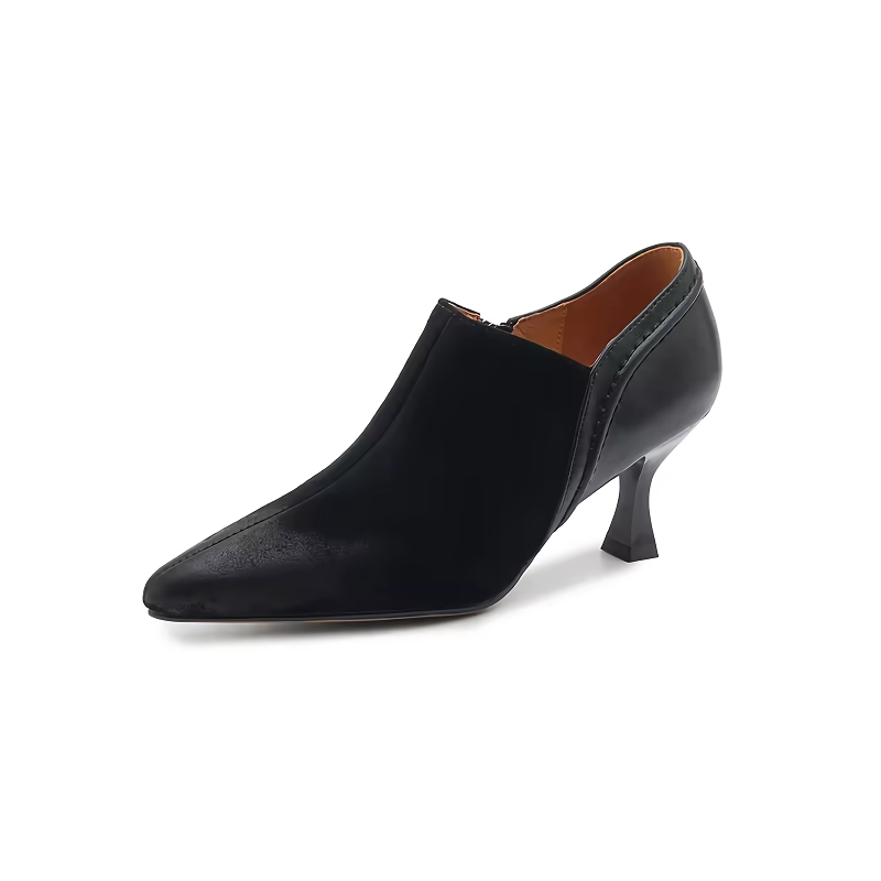 What sets our heels apart is the combination of high-quality materials and unique design elements. The genuine cow leather upper provides a luxurious feel and long-lasting wear, while the soft sheepskin insole ensures all-day comfort. The pointed toe and strange style heel add a distinctive touch that is sure to turn heads. Additionally, the zipper closure not only adds to the aesthetic appeal but also makes these heels easy to slip on and off.