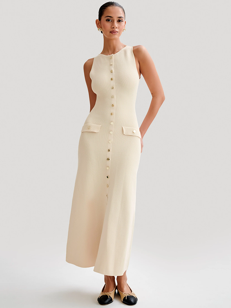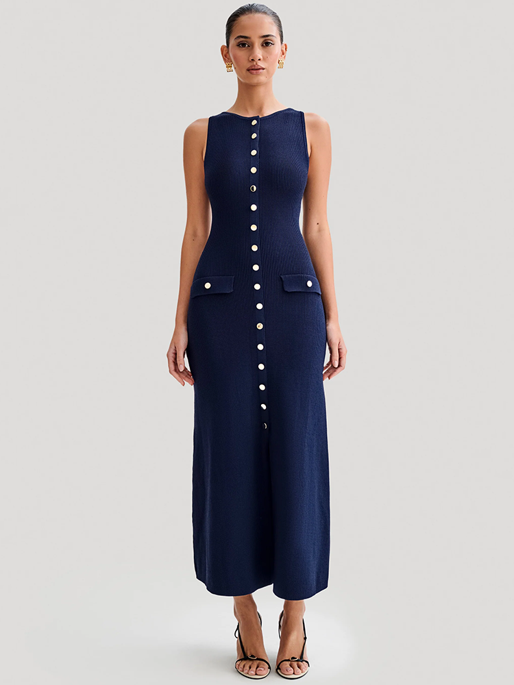 What sets our dress apart is its combination of classic style and modern convenience. The O-neckline and button decoration give it a timeless appeal, while the sleeveless design and pockets add practicality. The high-quality knit fabric ensures a comfortable fit that moves with you, making it ideal for any occasion. Plus, the ankle-length silhouette adds a touch of elegance that makes this dress truly special.