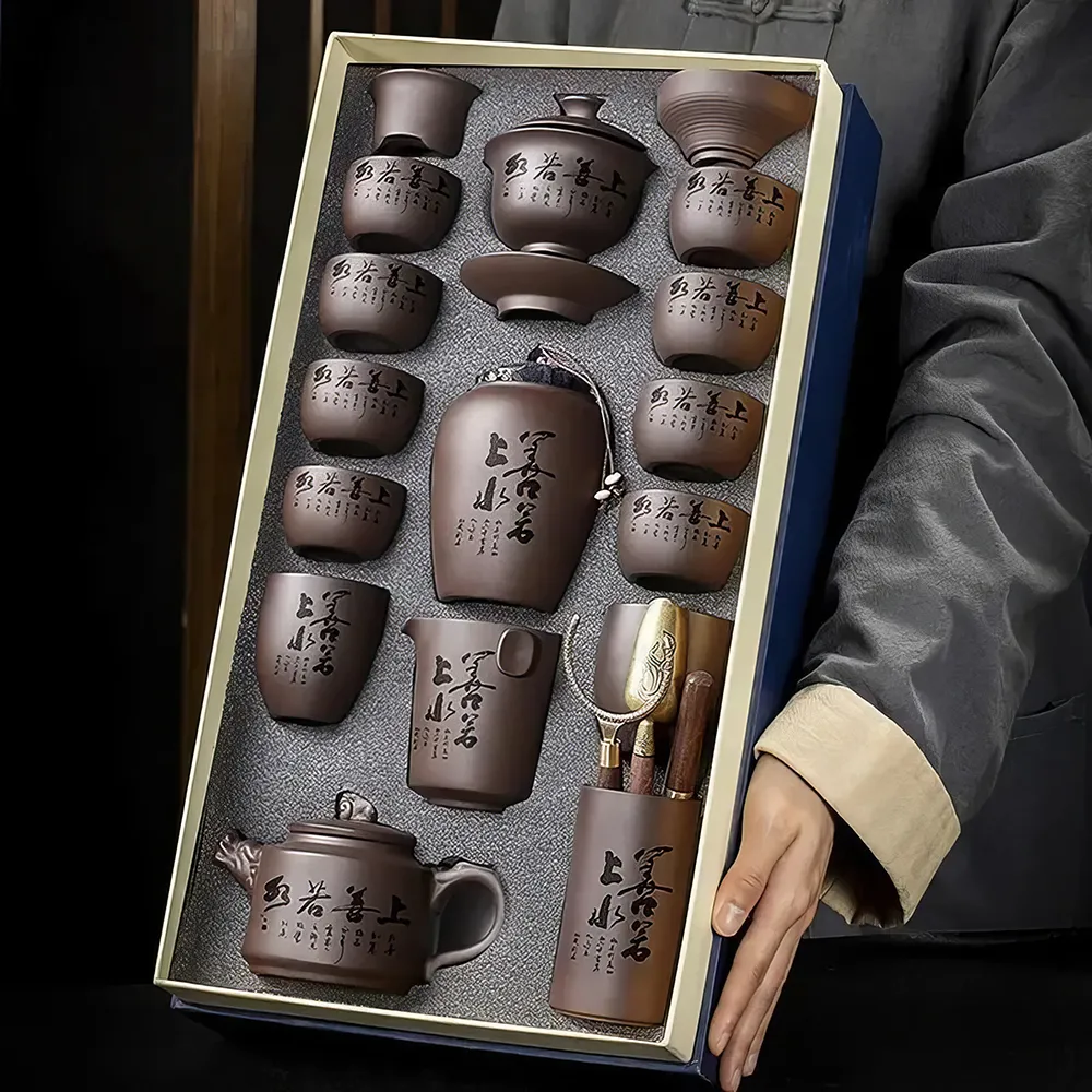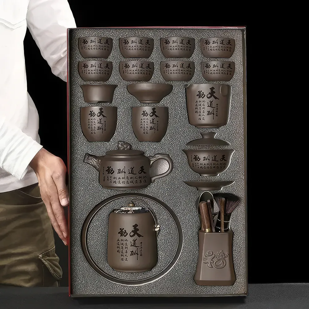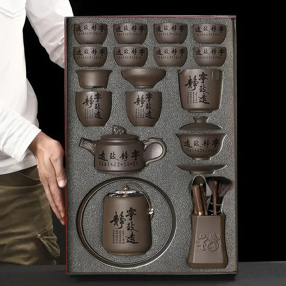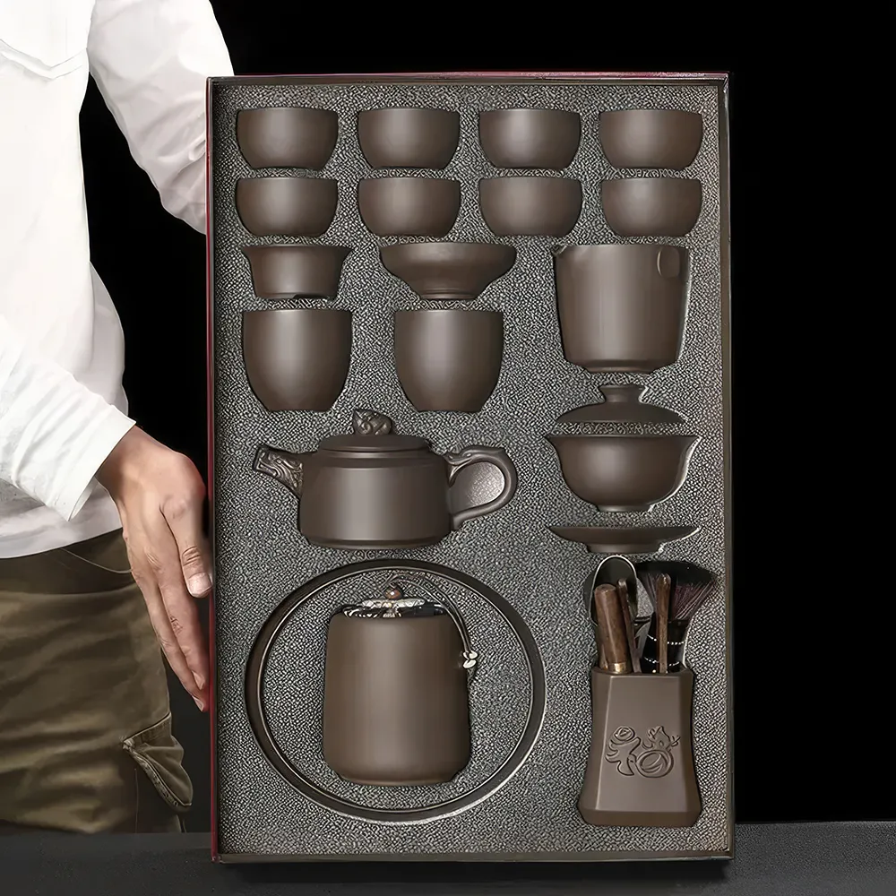 Made from the finest purple sand, known for its heat retention and enhancement of tea flavors, this tea set is a testament to skilled craftsmanship. Each piece is delicately handcrafted, undergoing a high-temperature firing process that ensures durability and a unique finish. The purple clay, sourced from Fujian province, adds an authentic touch to your tea experience.