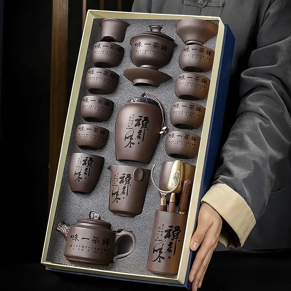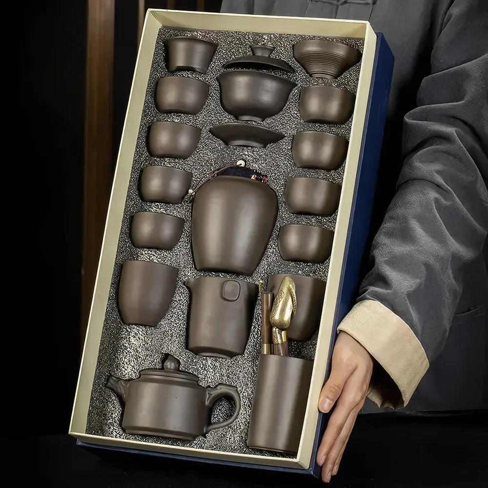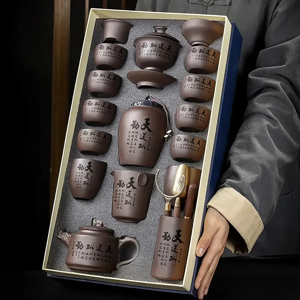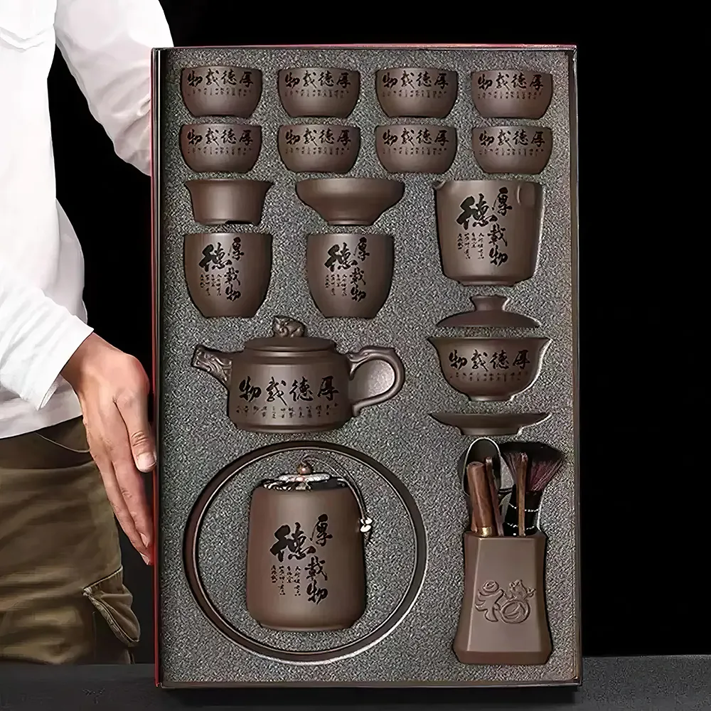 Made from the finest purple sand, known for its heat retention and enhancement of tea flavors, this tea set is a testament to skilled craftsmanship. Each piece is delicately handcrafted, undergoing a high-temperature firing process that ensures durability and a unique finish. The purple clay, sourced from Fujian province, adds an authentic touch to your tea experience.