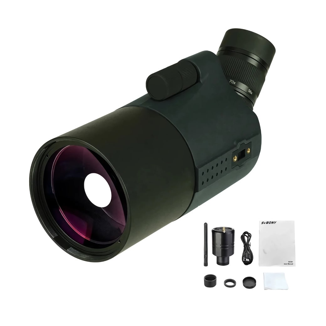 The spotting scope’s design includes a detachable 1.25″ eyepiece, compatible with SC001 WIFI cameras for real-time recording and sharing of your discoveries. The standard threaded interface seamlessly attaches to various tripods, and the adjustable exit pupil distance offers enhanced viewing comfort. Whether you’re tracking stars or shooting targets, this scope is equipped for precision.