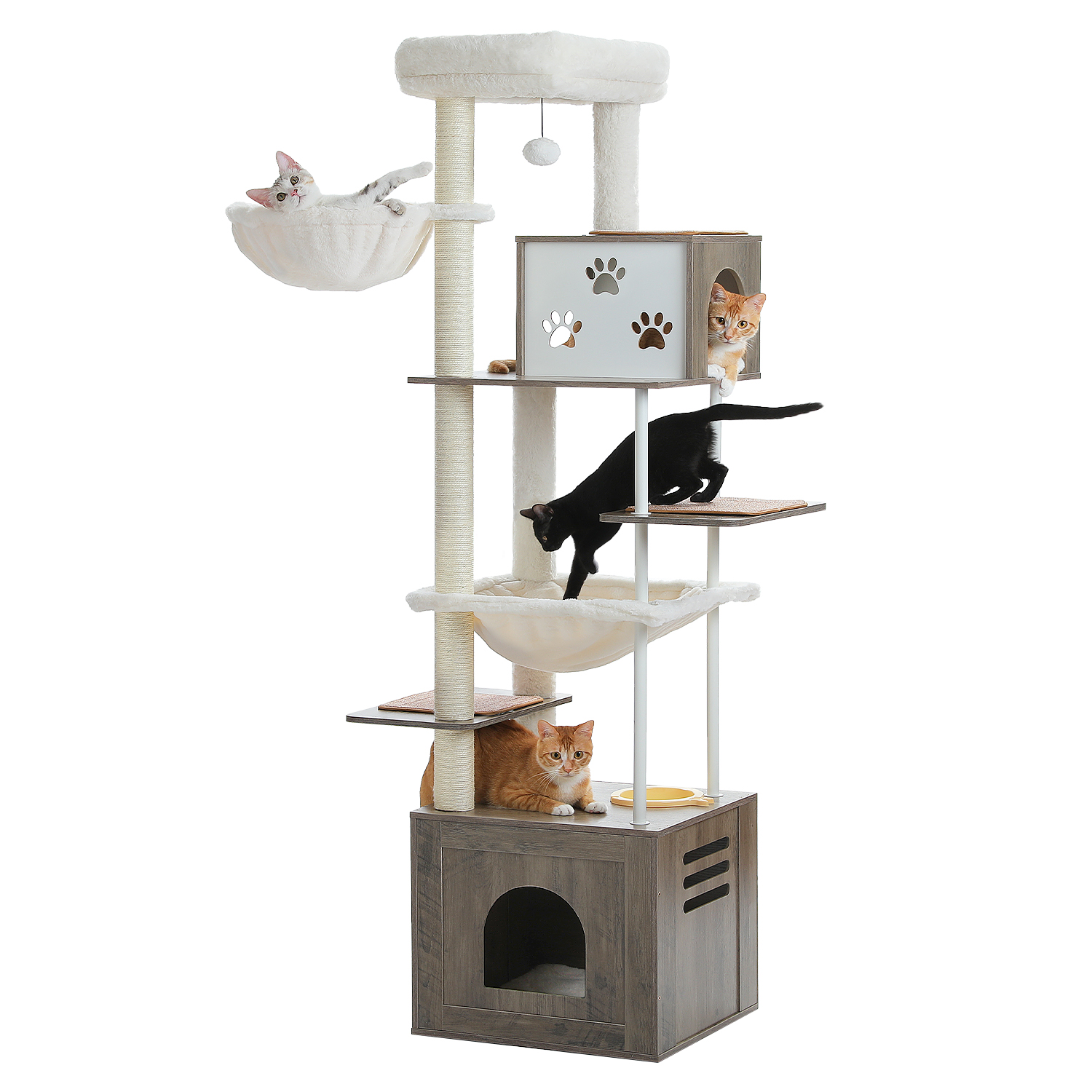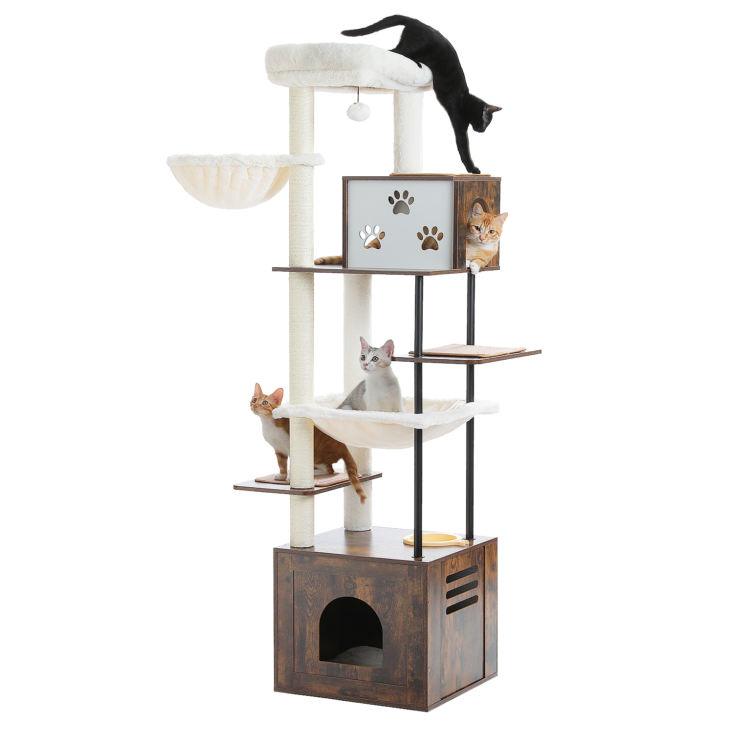 This cat tree is more than just a place for your cats to rest—it’s a complete playground. Standing tall at 75 inches, it offers seven levels of pure joy. The spacious condos are perfect for napping, while the top perch gives your cat a place to survey their kingdom. The sisal-covered posts satisfy your cat’s natural scratching instincts, keeping your furniture safe from claws. Each element is crafted with care, ensuring durability and stability for all types of cats, especially larger ones.