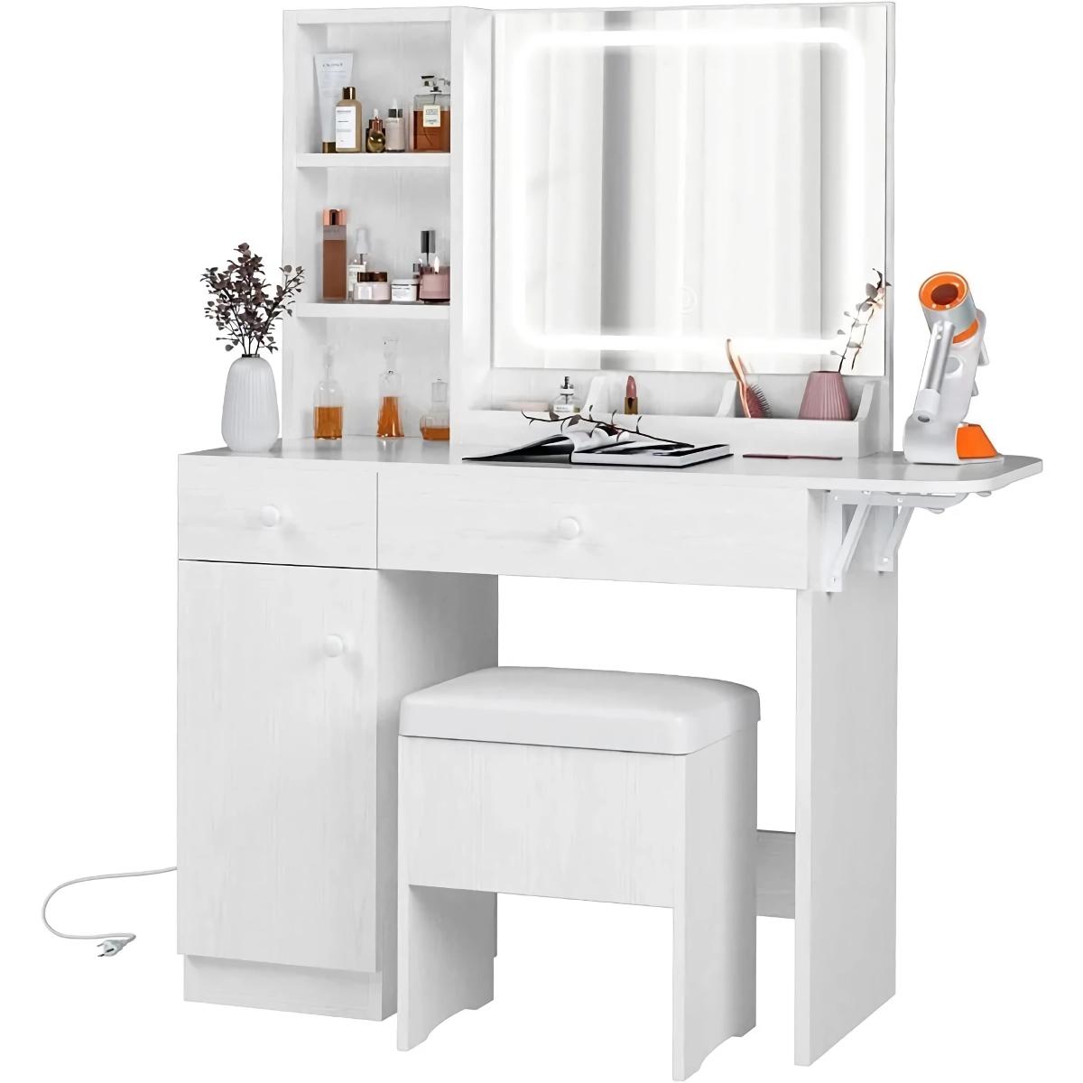 Equipped with an extra-large LED mirror featuring three adjustable light settings (warm, natural, and cold), our vanity desk ensures flawless makeup application at any time of day. The brightness can be customized with a simple long press, allowing you to perfect your look under ideal lighting conditions. Moreover, it boasts ample storage solutions including three open bookcases, three cubbies, two drawers, and a spacious cabinet with an adjustable shelf. The expansive countertop can be extended or folded to suit your spatial needs and style preferences.