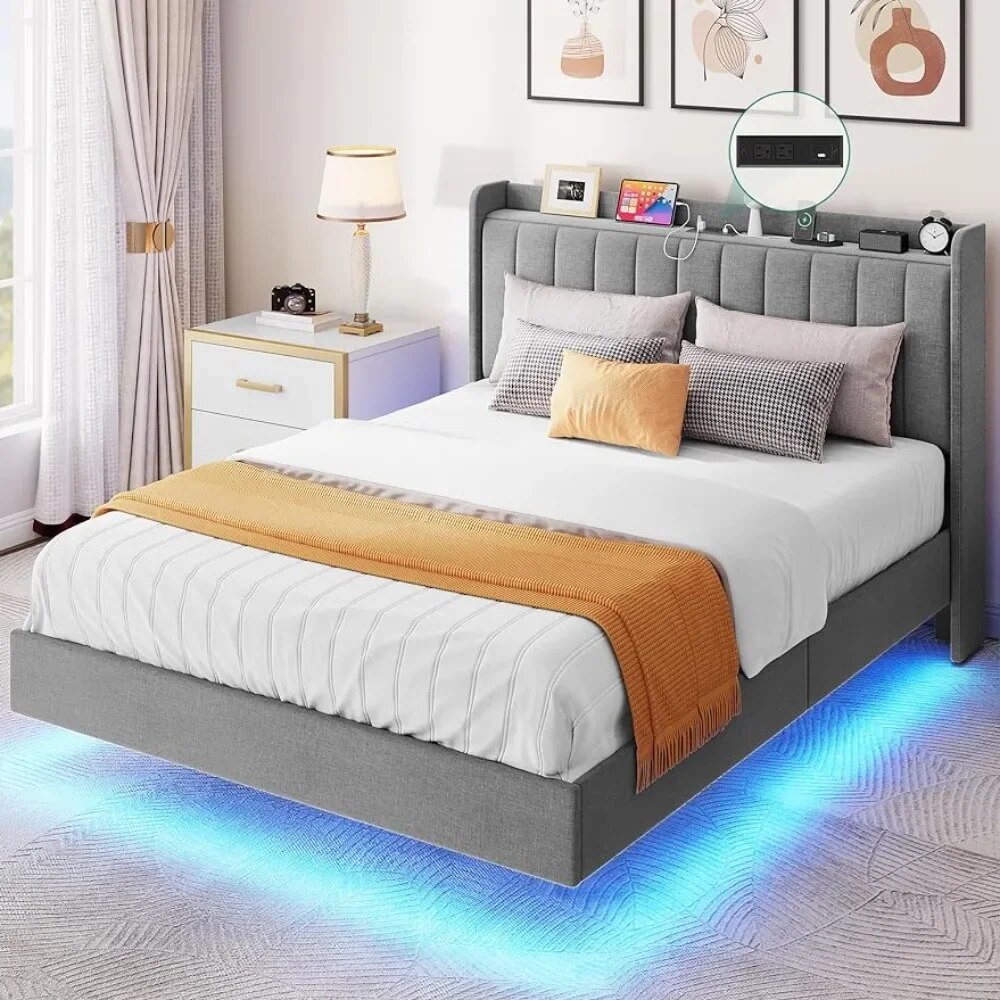 This bed frame isn’t just furniture; it’s a lifestyle upgrade. The floating design provides a sleek, off-the-ground look while ensuring stability with strategically hidden support legs that prevent the unpleasant shocks of toe stubbing. The headboard is not just for looks—it comes padded for comfort and includes built-in charging ports (1 USB and 1 Type-C), making it easy to keep your devices powered up without leaving your bed. Additionally, the bed features an LED RGB light strip around its base, offering adjustable ambience with over ten thousand color options, all controllable via a user-friendly app or a handy remote.
