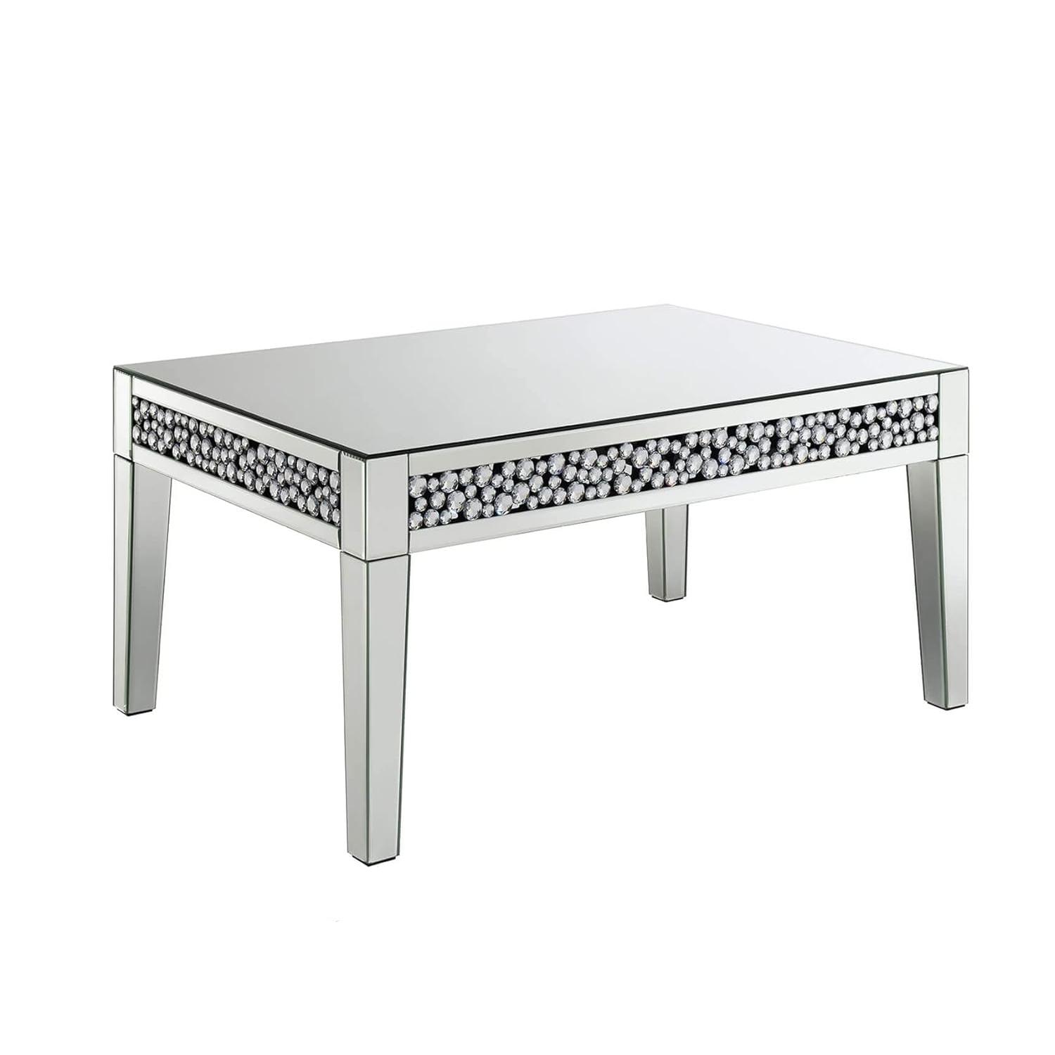 Crafted with the highest quality materials, this coffee table features premium silver mirror glass and a sturdy MDF frame. The table’s surface is adorned with exquisite crystal diamonds that catch and reflect light, creating a captivating sparkle that elevates the atmosphere of any room. Whether placed in a living room, office, or reception area, it promises durability and an enduring appeal.
