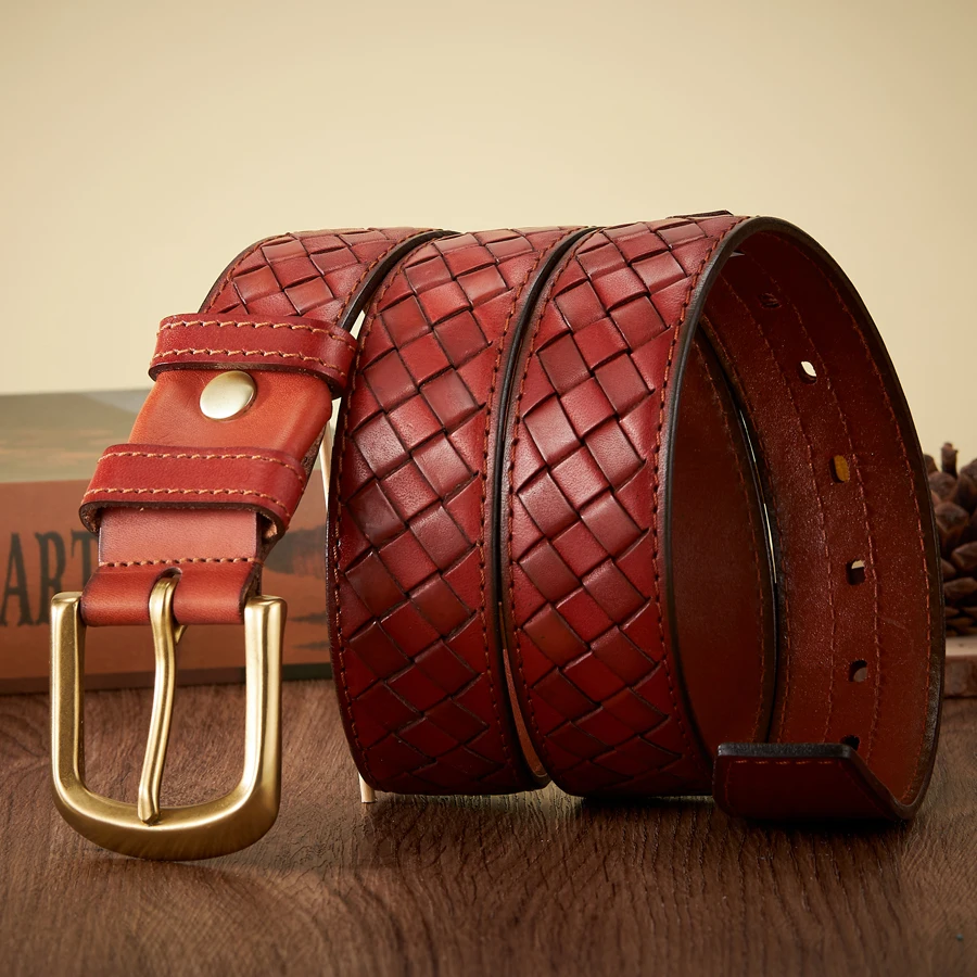 Add a touch of rugged elegance to your outfit with this 3.8cm braided leather belt, crafted from premium genuine cowskin. Designed for the modern man, this belt is not only a functional accessory but also a style statement. The luxurious woven pattern offers a unique texture that pairs perfectly with jeans, giving your casual or semi-casual look a fashionable edge. Featuring a solid copper buckle, this belt adds a timeless finish to any ensemble.