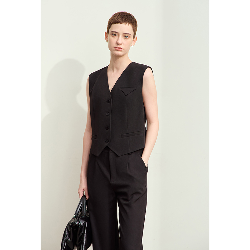 The solid pattern and elegant V-neck collar add a touch of timeless elegance, making it perfect for any professional setting. The single-breasted closure and spliced design provide a contemporary twist, while the decorative buttons and pockets add a practical element to this chic piece. Whether you’re heading to the office, a business meeting, or a casual outing, this sleeveless jacket is versatile enough to complement any outfit.