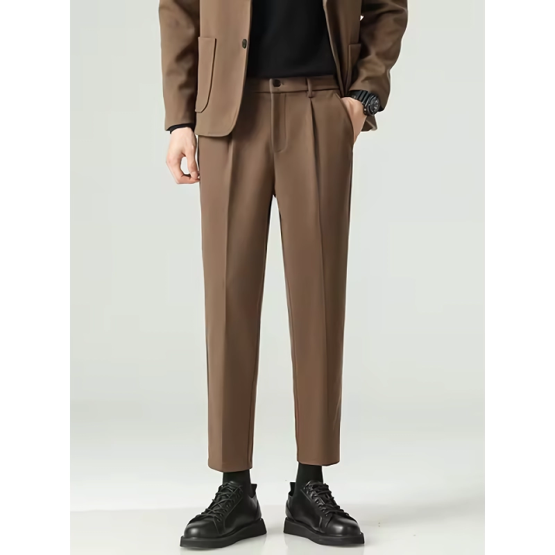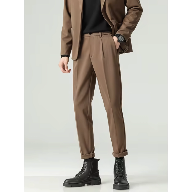 Our suit pants boast a sleek, pleated front and a straight, wide slim fit that flatters any silhouette. With a convenient zipper fly closure and available in a range of sizes, these pants are tailored to fit various body types perfectly. Choose from classic colors like black, gray, blue, and brown to match any outfit.