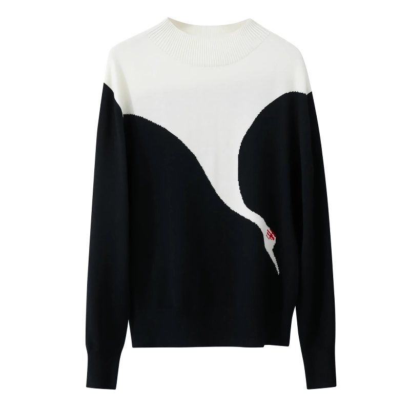What sets this sweater apart is its exquisite design and high-quality materials. The crane jacquard pattern is not only unique but also adds a touch of elegance and sophistication. The color patchwork design is stylish and versatile, allowing you to pair this sweater with various outfits. Additionally, the mock neck and drop sleeves bring a modern flair to a classic winter piece.