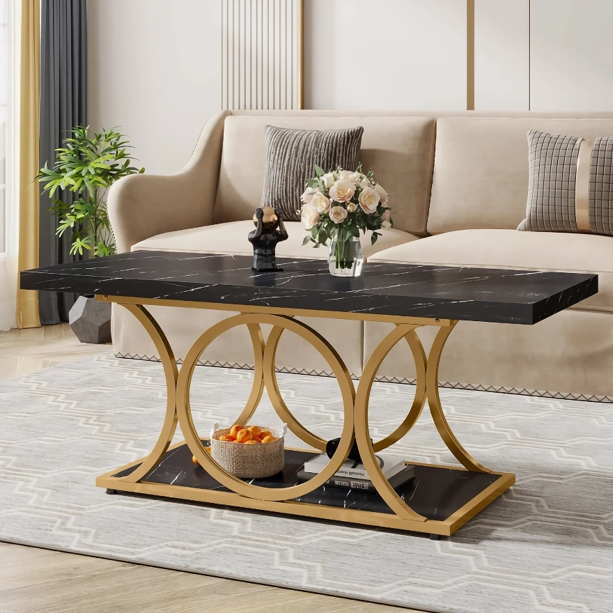 The table’s top tier features a luxurious faux marble finish, not only adding an element of sophistication but also boasting waterproof, scratch-resistant qualities for ease of maintenance. The stylish metal base, with its intricate circular and arc design, transforms what could be just a simple table into a remarkable piece of art. This coffee table doesn’t just stand—it captivates.