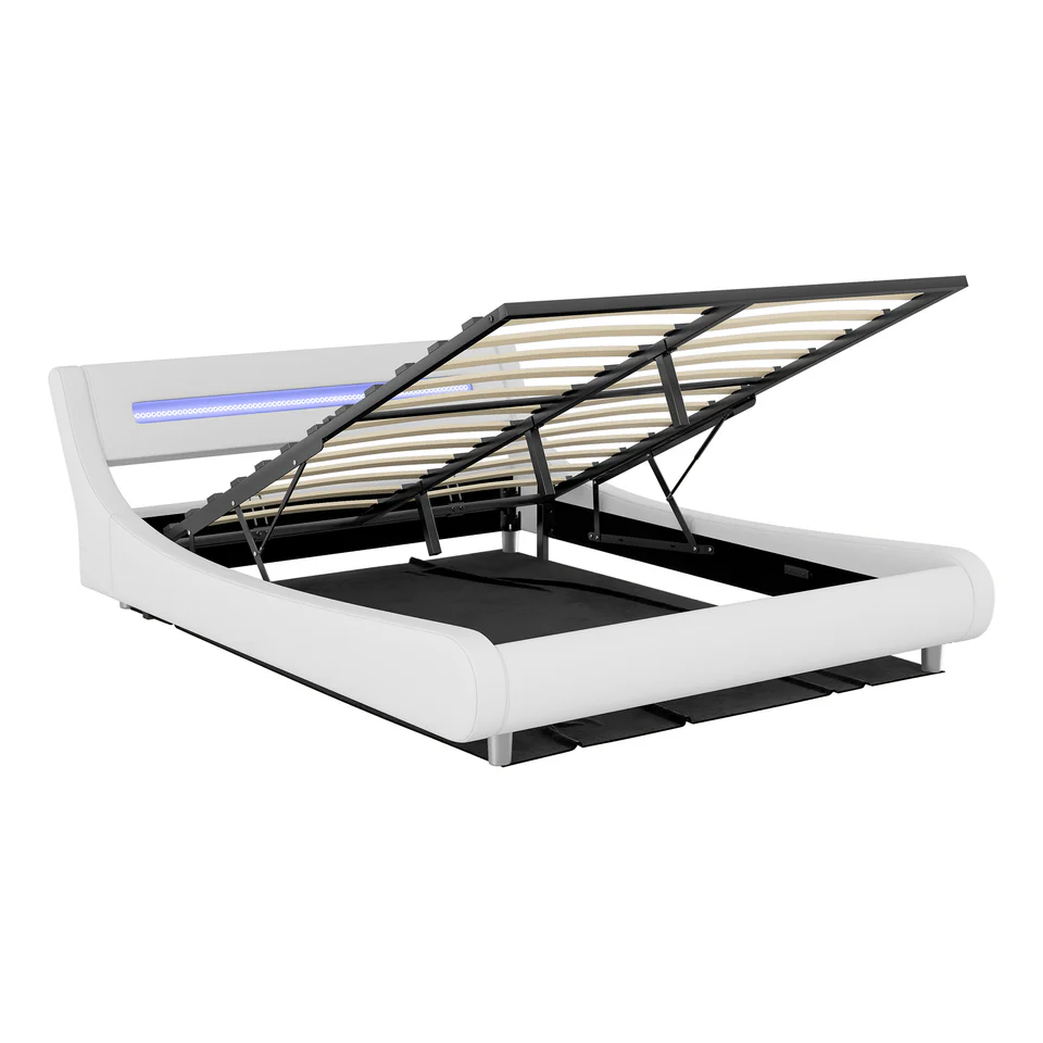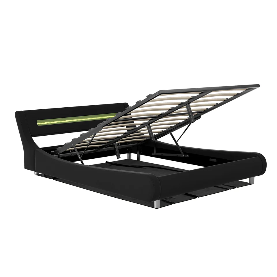 Our bed boasts a fully upholstered frame, lending a sleek and sophisticated touch to your bedroom. The highlight, an innovative LED-lighted headboard, offers adjustable lighting with 20 color options, controlled remotely for your convenience. This feature not only adds ambiance to your room but also serves as a practical light source. The bed’s curved, low-profile metal frame is wrapped in faux leather, adding a luxurious texture and feel.