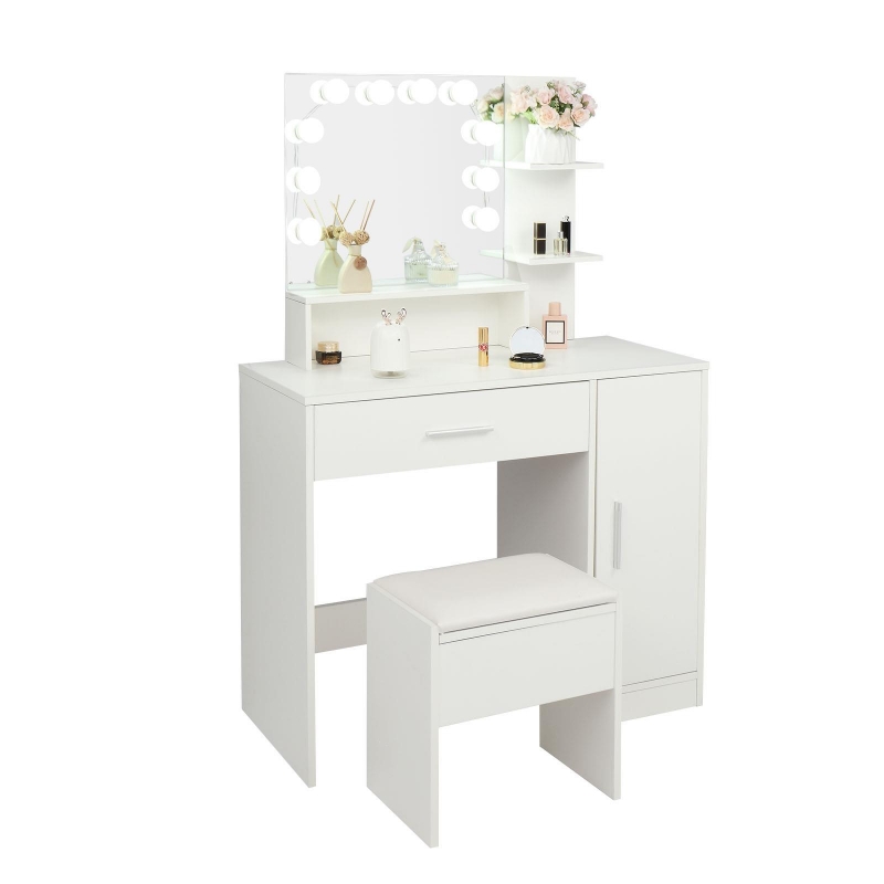 Modern White Vanity Makeup Table Set with Lighted Mirror and Storage