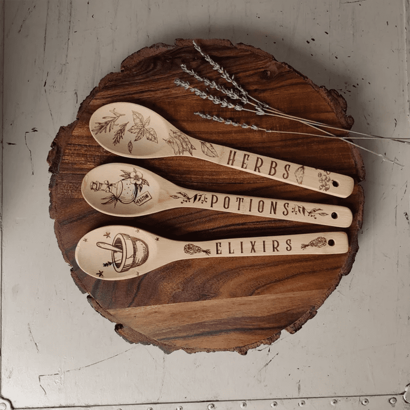 • Detailed wood-burning designs featuring witches, cauldrons, herbs, and potions
