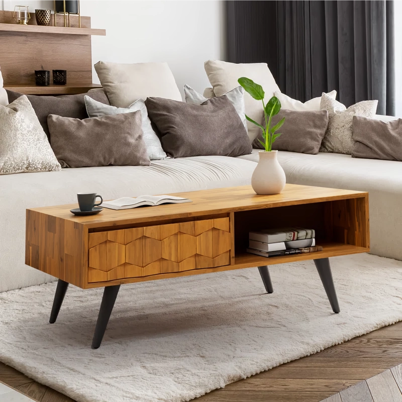 Transform your living room into a stylish haven with our Wood Coffee Table featuring two symmetrical storage drawers and intricate geometric details. Crafted from premium solid acacia wood and complemented by a sleek metal base, this coffee table strikes the perfect balance between rustic charm and contemporary elegance. Elevate your space with the perfect blend of functionality and aesthetics. Ideal for cozy coffee moments, entertaining guests, or simply showcasing your style, this coffee table is designed to meet your needs.