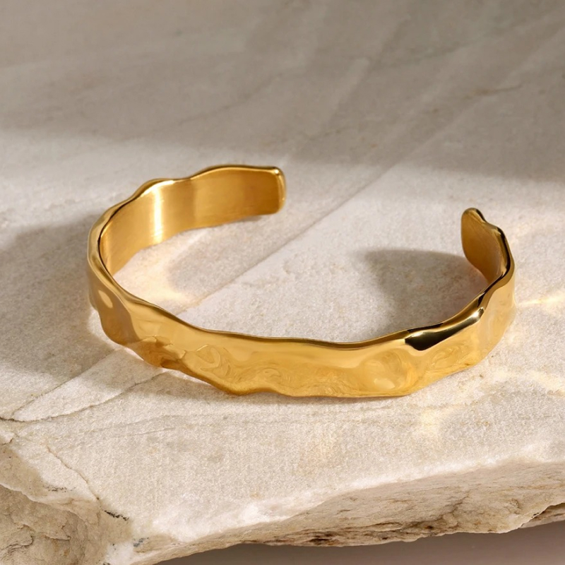 Elevate your jewelry collection with our stunning Waterproof Wide Cuff Bracelet. Crafted from high-quality 316L stainless steel and plated with luxurious 18K PVD gold, this bracelet exudes sophistication and style. Its wide design and textured surface make it a statement piece that can easily transition from casual outings to elegant evenings. Whether you’re dressing up for a special occasion or adding flair to your everyday look, this cuff bracelet is a perfect choice.