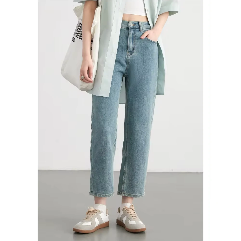 What sets these jeans apart is their impeccable fit and timeless style. The high-waisted design accentuates your waistline while the straight leg cut elongates your legs, giving you a sleek and sophisticated appearance. The fabric is both durable and comfortable, ensuring that these jeans will be a favorite for seasons to come. The moderate softness provides just the right amount of comfort without compromising on structure, making them ideal for all-day wear.