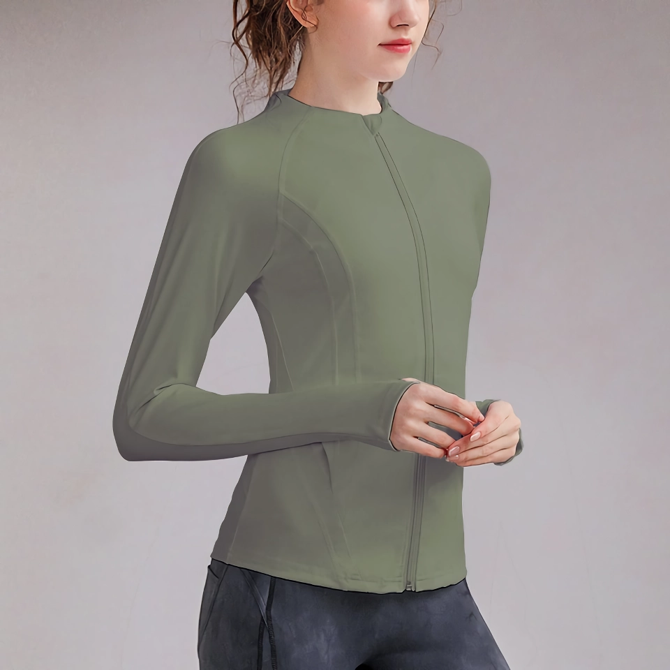 Crafted from a blend of high-quality nylon and spandex, this jacket offers the perfect combination of flexibility and durability. The mandarin collar adds a touch of elegance, while the slim fit ensures a flattering silhouette. The thumb holes keep your sleeves in place, providing added warmth and comfort during cooler weather. Plus, the full-length zipper allows you to easily adjust ventilation, so you can stay comfortable no matter the intensity of your workout.